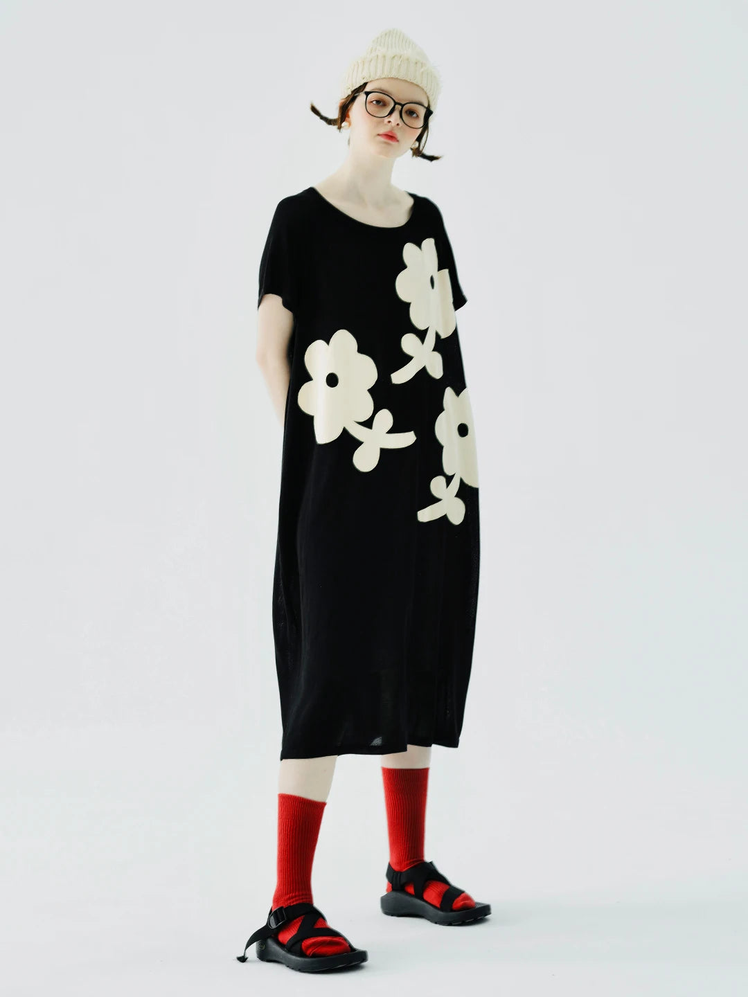 The Gabrielle Floral Black Dress is a chic and playful addition to your wardrobe. Made from a soft and breathable cotton blend, this dress features a relaxed fit with a modern touch, decorated with three oversized white floral appliqués. The lightweight fabric allows for an airy silhouette that’s perfect for casual outings or summer gatherings. The classic black color brings a sophisticated contrast to the white floral accents, making it both timeless and unique. The simple round neckline and short sleeves offer versatility, making it easy to dress up or down with accessories.