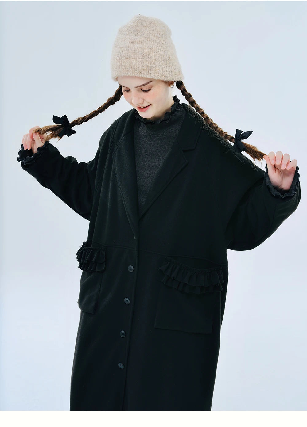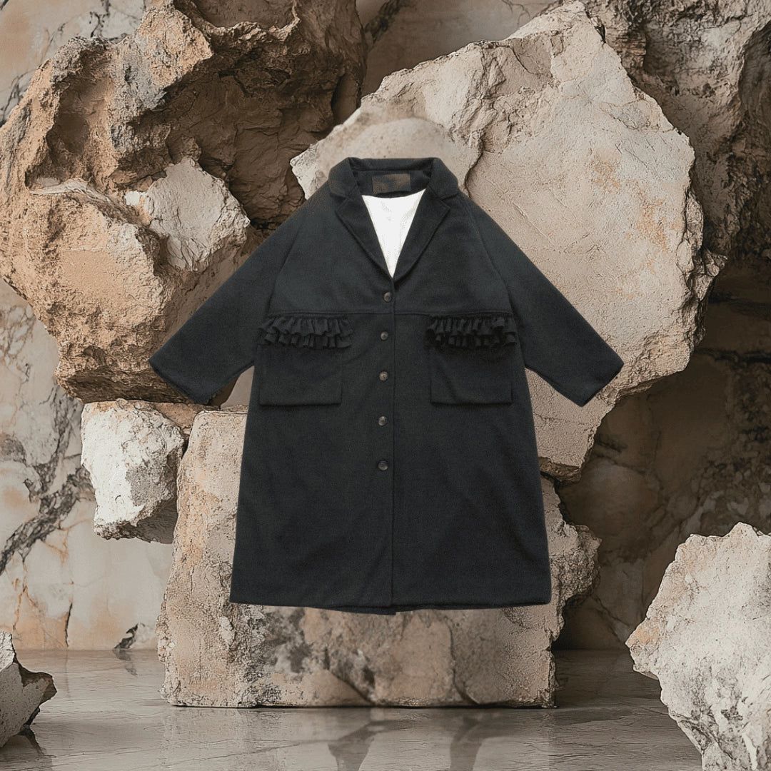 The Louise Frill-Detail Wool Coat combines a classic silhouette with playful embellishments, making it perfect for those who appreciate understated elegance with a touch of whimsy. Crafted from a premium wool blend, this coat features soft ruffled detailing on the pockets, giving a feminine twist to its structured design. The straight cut and tailored collar provide a polished look, while the medium-length design ensures versatility—ideal for both casual and more formal settings.