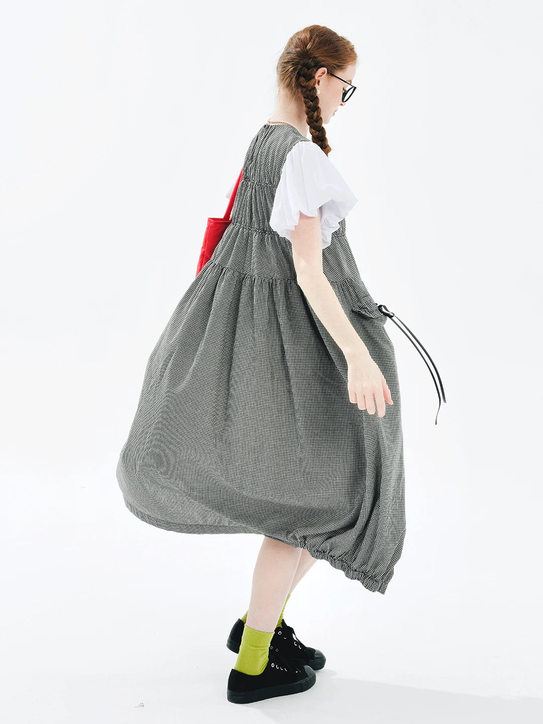 Design Details: Sleeveless, tiered structure with a gathered waistline and side drawstring ties for adjustable fit