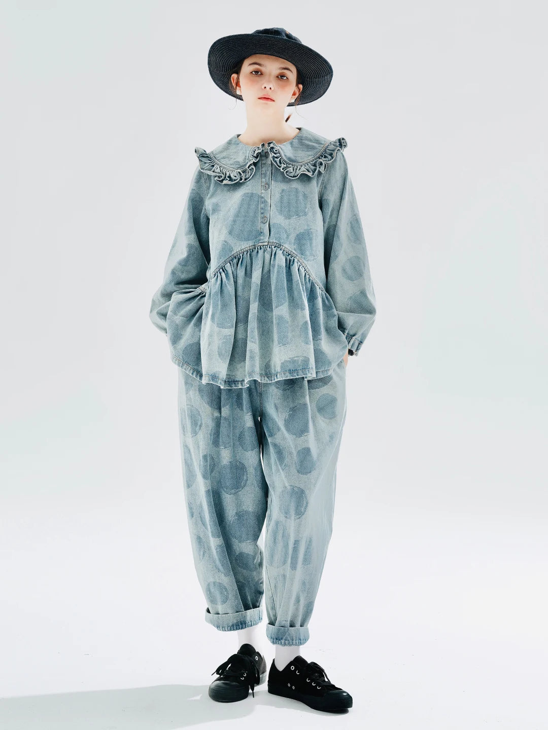 To maintain the quality and unique design of your Oversized Polka Dot Denim Pants, please follow these care instructions: