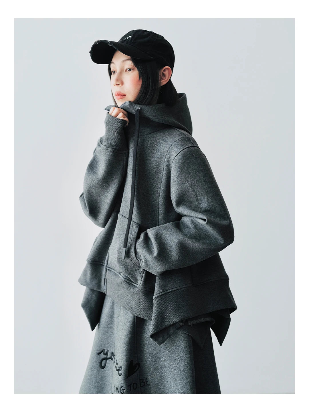 The "Urban Edge" hoodie combines comfort and style, making it an everyday essential. Made from a soft, high-quality cotton blend, this grey hoodie features a full-length zipper and spacious front pockets for functionality. Its unique design includes a layered effect at the hem, giving it an urban, avant-garde vibe. Perfect for layering over casual outfits, it adds a touch of street-style flair to your wardrobe.